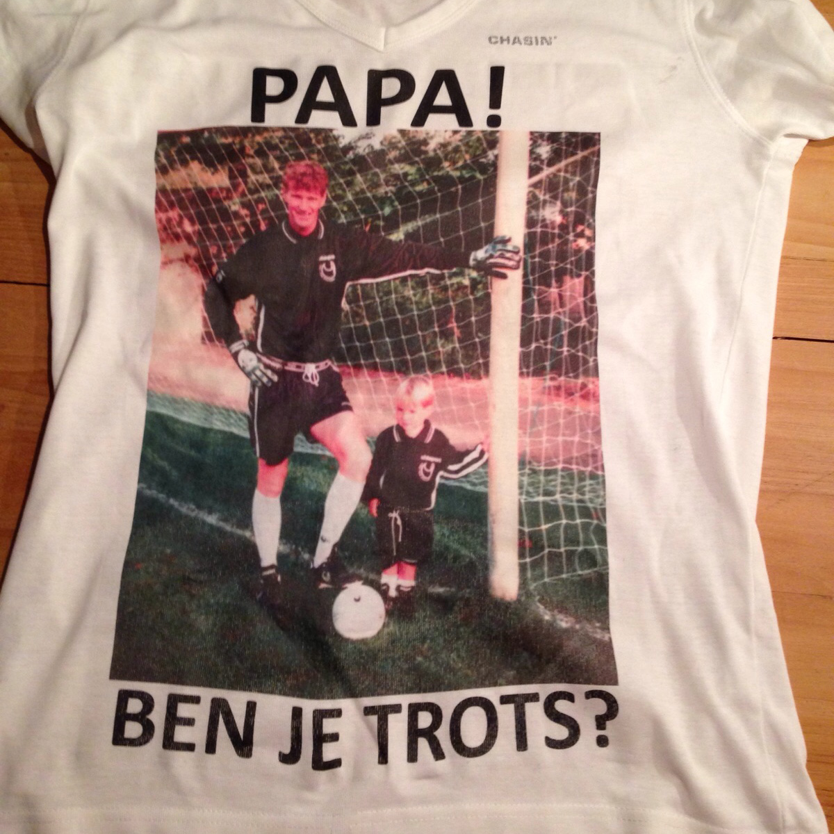 Den Dungen scoorde genoeg, tijdens het met 2-5 gewonnen duel. En Van Grinsven pikte ook een doelpuntje mee. Maar dat kon hij vooraf enkel hopen; scoren tegen de club waar zijn vader Jan hoofdtrainer is. De jonge aanvaller nam de gok en besloot een shirtje te laten drukken, voor het geval dat. “Op zaterdagavond heb ik Sinterklaas gevierd met mijn vader en toen heb ik tegen hem gezegd dat ik een verrassing voor hem in petto had. Alle voorbereidingen waren getroffen, maar de moeilijkste opgave was nog wel even zien te scoren. Gelukkig lukte dat.”