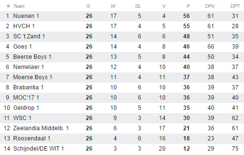 De titelkansen leken vervlogen. Nuenen kwam zelfs vier punten achter de nieuwe koploper HVCH te staan. Maar in de laatste periode kwam de vorm op tijd terug en werd alsnog toegeslagen. Van den Dungen: “We hadden in de beslissende fase geen geblesseerden of geschorsten, iedereen was weer in goede doen. We zetten een goede reeks neer en bleven drie wedstrijden op één punt staan. De druk was groot op HVCH en uiteindelijk bezweken ze. Daarna hebben we het niet meer afgegeven, met tot slot een thriller tegen Brabantia.”