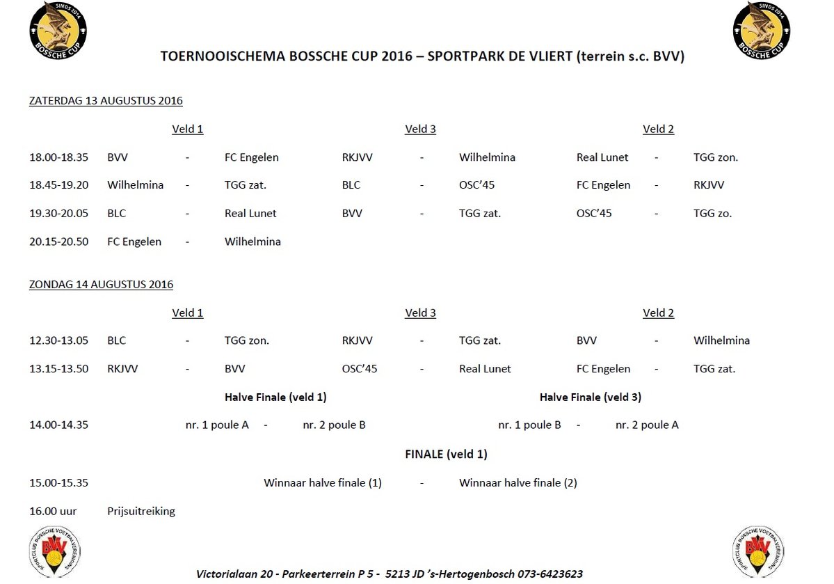 In poule A treffen BVV, FC Engelen, RKJVV, Wilhelmina en het zaterdagteam van TGG elkaar. In poule B zijn na loting BLC, OSC’45, Real Lunet en TGG zondag terechtgekomen. Onderstaand het speelschema. Na de poulewedstrijden volgen kruisfinales en natuurlijk een finale. Toeschouwers zijn van harte welkom.