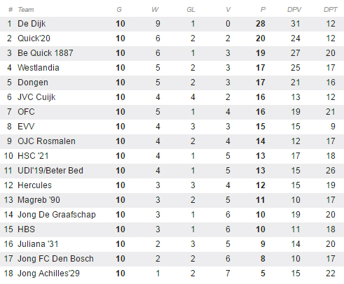 Topscorer Kaars scoorde al liefst 18 keer voor de Amsterdamse club. Hoe Van Doremalen de 28-jarige spits gaat afstoppen, weet hij nog niet precies. “We gaan het hem zo moeilijk mogelijk maken. Ook dat zal lastig worden, maar er zijn gekkere dingen in de voetballerij gebeurd.” Het duel met de koploper plichtmatig afwerken en de focus leggen op de wedstrijden daarna, daar wil Van Doremalen niks van weten. “Wij richten ons elke week gewoon op zondag. Elke week zijn er weer drie punten te halen. Na De Dijk krijgen we Juliana’31 en HBS. We gaan dus voor negen punten. Ja, misschien zijn Juliana en HBS wel belangrijker, omdat we die onder ons moeten zien te houden, maar wat is er mooier dan van een team te winnen dat nog niemand heeft weten te verslaan?”
