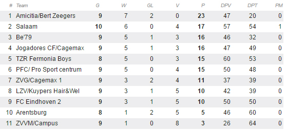 Sinds dit seizoen speelt Van der Bruggen ook in de zaal op hoog niveau. In de landelijke eerste divisie zelfs, bij BE’79. “Ik had al enige tijd contact met Dennis Kapteijns (Sint Michielsgestel, red.) en Kenneth van de Wiel (Best Vooruit, red.), die er ook spelen. Die hebben het voorgelegd aan coach John Adriaansen en op die manier zijn Rico (de Laat, red.) en ik bij BE gekomen.” Het gaat naar behoren, vertelt de middenvelder: “Ik mag niet klagen, volgens mij. Zaalvoetballen doe ik al heel lang, maar niet op dit niveau. Ik heb gespeeld in Helvoirt, Vught, Schijndel, Haaren en Baarle-Nassau. Maar nu doe ik het alleen nog maar in Berkel-Enschot bij BE hoor, anders ben ik teveel van huis. Het bevalt me uitstekend. We hebben een mooi team, dat goed meedraait in de Eerste Divisie. Vanavond spelen we een belangrijke wedstrijd tegen Jogadores CF/Cagemax. Bij winst doen we goede zaken.”