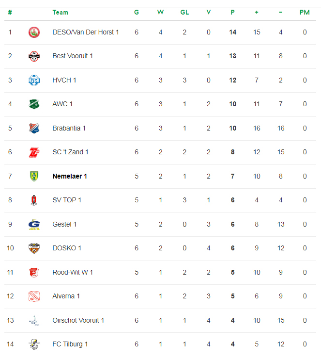 Zondag is promovendus Oirschot Vooruit, de club van mister Nemelaer Piet Drijvers, de tegenstander. “Erg leuk natuurlijk om zo’n derby te spelen”, aldus Van Geffen, die over een paar weken hoopt te zien dat Nemelaer is aangesloten bij het linkerrijtje. “We scoren met Joeri (Vugts, red.), Gijs (van Baast, red.) en Giel van de Ven tot op heden vaak. Tel daarbij op onze stabiele verdediging onder leiding van Kamile de Jong, die zondag ook weer een paar prima ballen pakte, en het middenveld met als stuwende kracht aanvoerder Luuk Vermeer. We hebben een uitgebalanceerd team, waarbij op dit moment een paar spelers van het tweede elftal dicht bij het eerste komen. Dat maakt het leuk.”