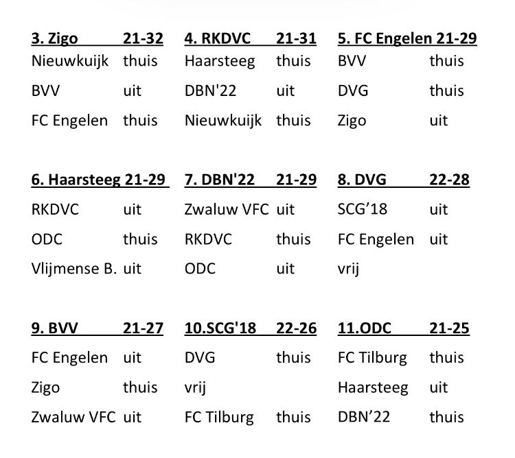 Om het allemaal nog wat gecompliceerder te maken, gaat de nummer 3 van de ranglijst juist spelen voor promotie naar de 2e klasse. Als Zwaluw, dat zondag de kampioenswedstrijd tegen DBN’22 speelt, zoals verwacht ook de derde periode wint, geldt dat ook voor de club die op de 4e plaats eindigt. Er is de komende weken dus extra veel om voor te strijden. Wij volgen het op de voet!