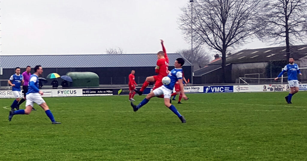 Via Guillermo le Couvreur nam Real Lunet nog wel de leiding, maar dankzij Damian van Bijnen (met de kop) en Pim van Hulten won RKDVC (verdiend) met 2-1. De ‘Osse’ derby tussen Nooit Gedacht en Margriet eindigde in 0-0 en de andere regenachtige derby – SCG’18 tegen Den Dungen – werd 4-2 door doelpunten van Pim van Erp, Stan van Rooij, Arthur Bot, Axel van Litsenburg (SCG) en Bjorn de Kort en Joep Kaarsgaren (Den Dungen).