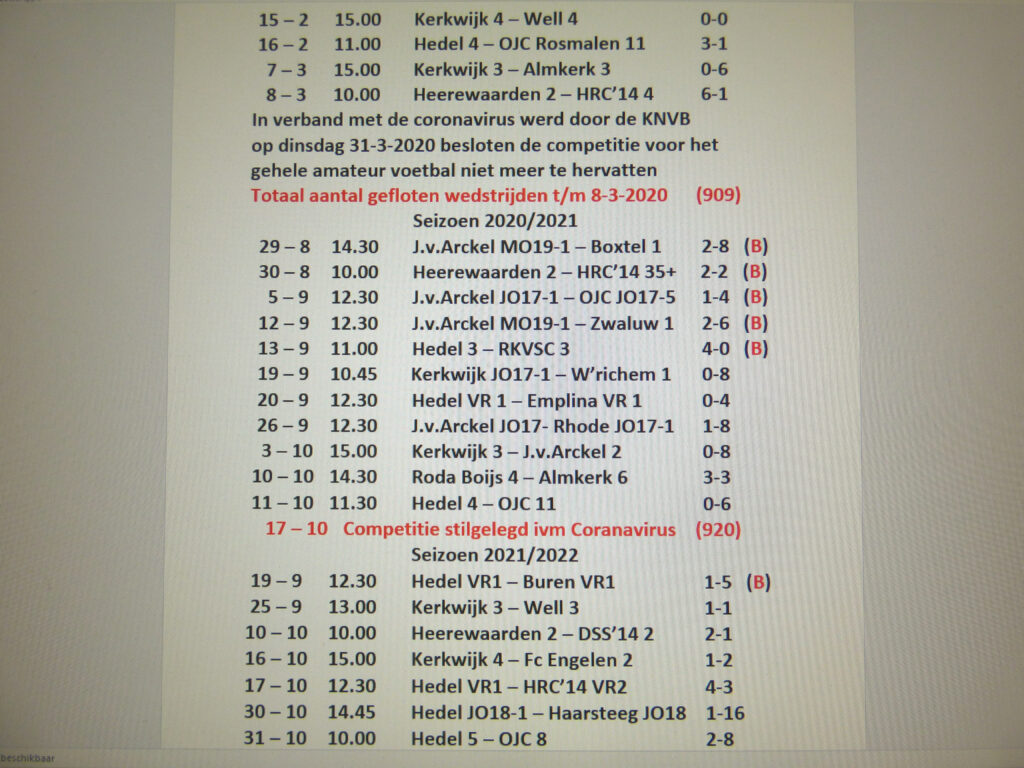Al 35 jaar houdt Gerrit wél zelf nauwgezet bij welke wedstrijden hij allemaal heeft gefloten. “Eerst op papier, later overgestapt naar de computer. Inmiddels zijn het er dus meer dan duizend, waarvoor ik in april nog in de bloemen werd gezet bij Hedel. Ik fluit ieder weekend, behalve als er een mooie derby of andere speciale wedstrijd op het programma staat. Die dagen houd ik vrij. Roda Boys tegen Nivo Sparta bijvoorbeeld, of OJC – UNA. Een oud-collega van me komt dan altijd met UNA mee en dan kletsen we een middagje bij.”